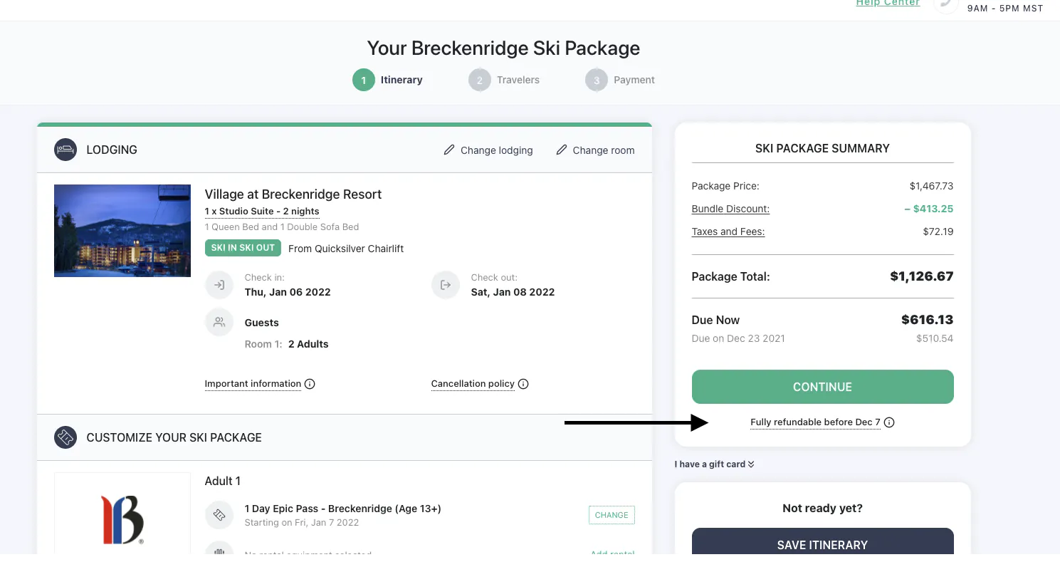 2. Itinerary, travelers and payment Page: Once you have proceeded to Itinerary page, the Cancellation Policy can again be accessed under Ski Summary section.