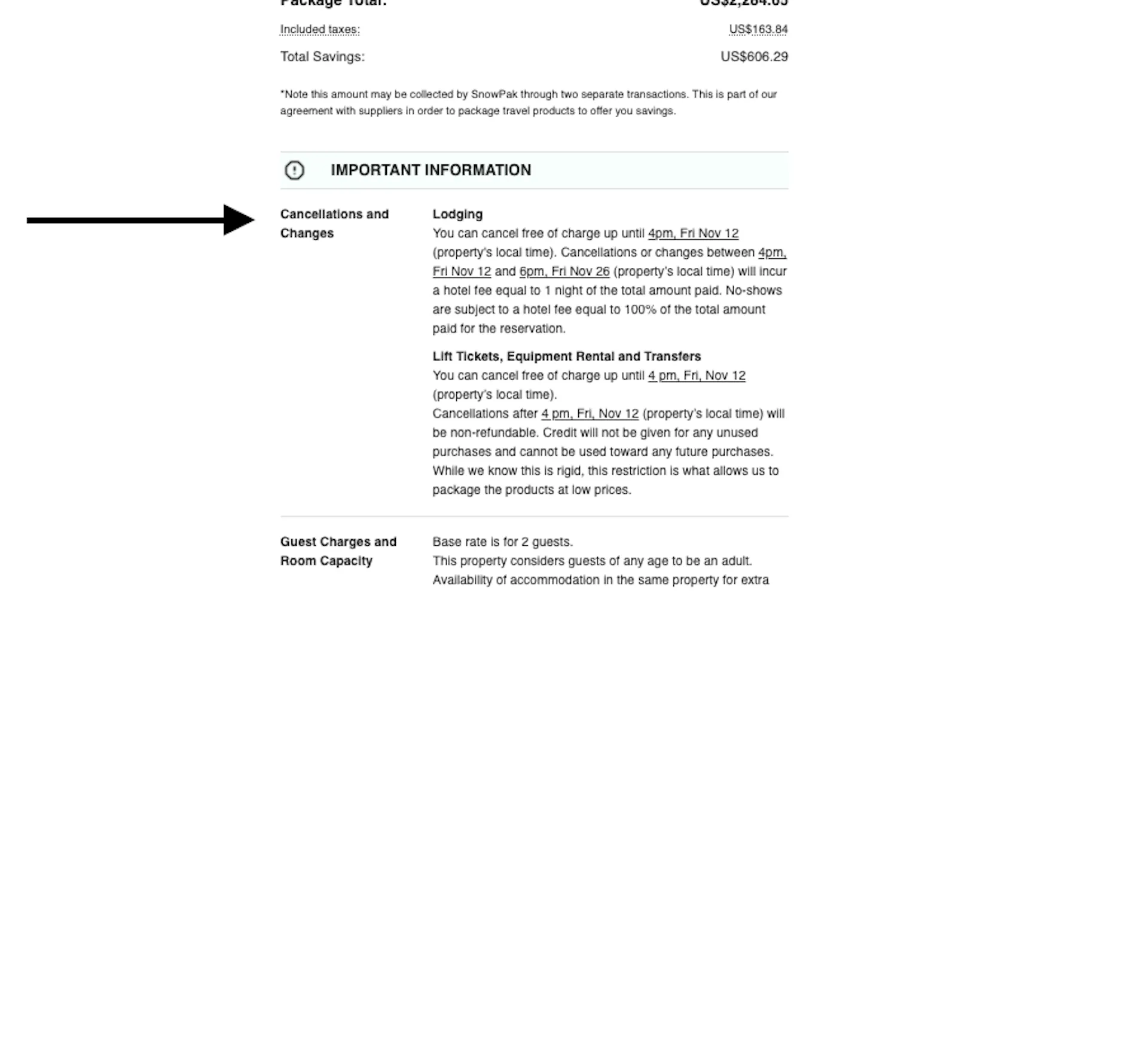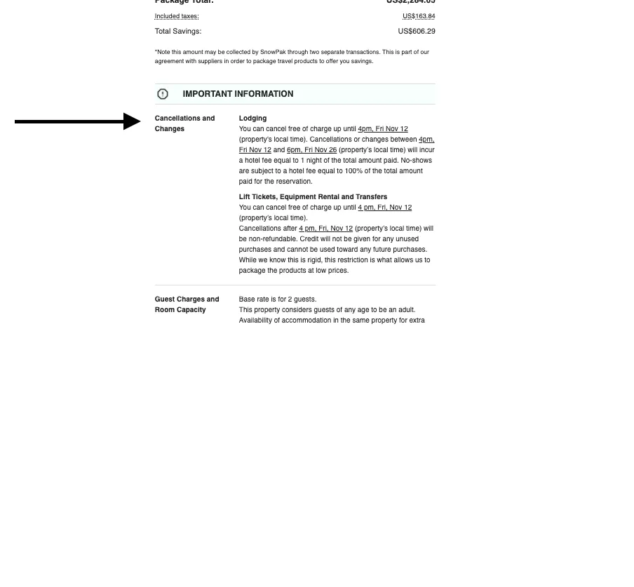 1. Confirmation Page: Once payment is processed and booking confirmed, the Cancellation Policy can be located under Lodging section or at the bottom of the confirmation page.